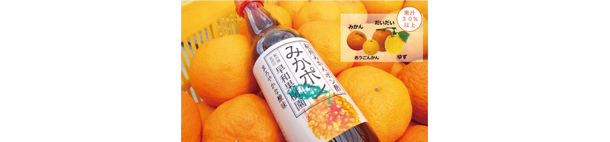 マー ポン酢もね、そうなんよ。年始の注連飾りあるやん。でも最近、飾る人減ったやん。最初ダイダイを注連飾り用に、枝と葉っぱつけて何時いつに出荷するの受託してたんやけど、市場に問い合わせたら「もう要らんわ」って言われる(苦笑)。「ええ?どうする?」ってなって。自分らが毎年のように出荷してたやつのあまりもんのを搾って自家製ポン酢を作ってたんやけど、それでもせなしゃあないってなって、あとから作ったが『みかポン』よ。