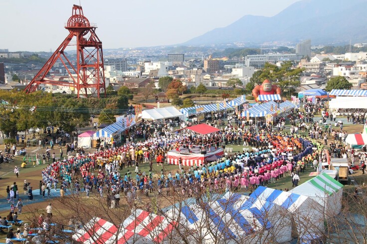 TAGAWAコールマイン・フェスティバルは、二本煙突と竪坑櫓が保存される石炭記念公園で