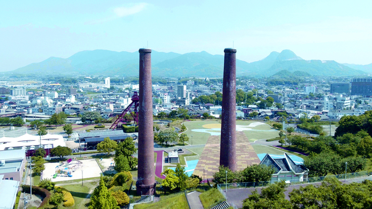 炭坑節の歌詞にも出てくる「二本煙突」と「竪坑櫓」は、今もなお、その姿を残しています。