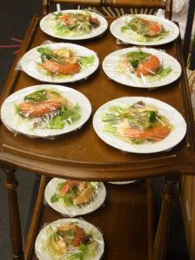 食堂の方は直接の関連をうたってはいませんが、店内には大石の甥の書いた絵が飾られています。百年前の太平洋食堂開店時には、ドクトル自ら料理をふるまっていましたが、だんだん飽きたのか、医院が忙しくなったのか、やはり外国帰りの地元の方にコックを任せたということです。写真は2013年の際、苦心して?再現し、舞台上の太平洋食堂で本番の中に、出されたコールド・サーモンのアンチョビソース添えです。本番のたびにオードブルと、ビーフコンソメ、カレーと五目寿司を作りました。