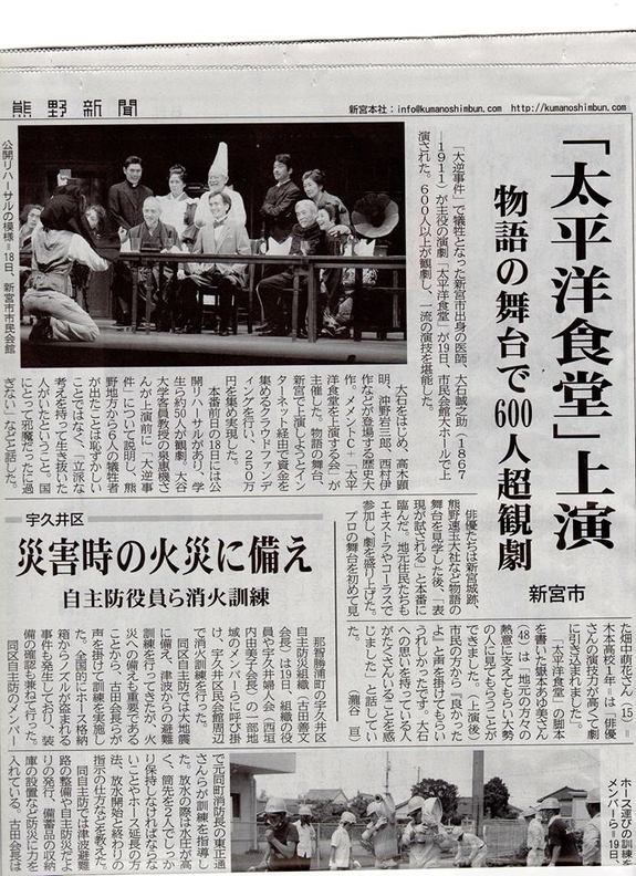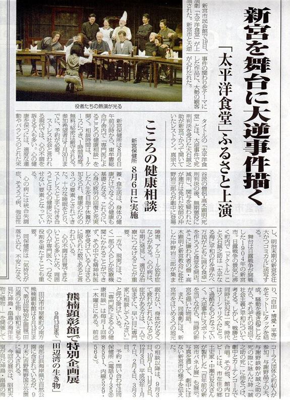 しかし、大変残念な事に、一月ほど前の地元の人権に関する会議などで、歴史的な用語や背景、大逆事件と地元が関係する題材が高校生には不適切であるという意見が出た為、学校などでの公開リハーサルへの動員宣伝が不可能となりました。そのため、新宮市に「現地での上演に関する配慮」を申し入れ、教職員や市役所職員への観劇の呼びかけを新宮市で行っていただきました。御蔭で公開リハーサルには、三重県の高校生や地元の教職員の方などが参加、高速バスで駆けつけてくださった泉先生のレクチャーもありました。