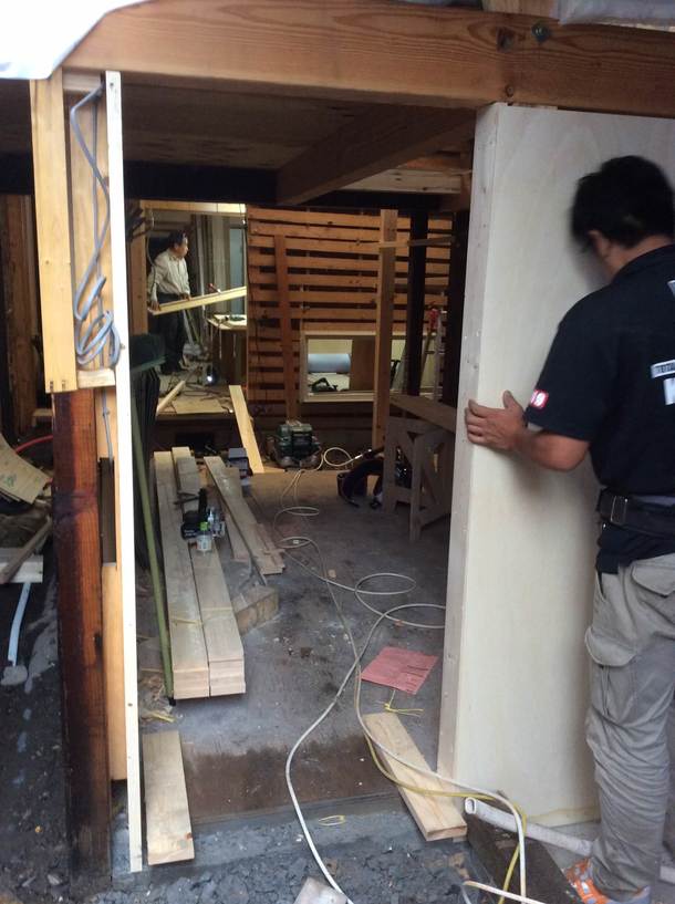 日々古民家リノベーションの醍醐味を感じております。中庭の形が徐々に見えるようになってきました。様々な角度や高さの屋根や庇に囲まれた吹抜けを実際に目の当たりにすると、思った以上に光がキレイに降りてくるんだなとか、古い木材と新しい木材のバランスが美しいなと感じるばかりです。もちろん、リノベーションの大変さも感じております。新たに解体した場所の構造が若干脆弱で改めて補修せねばならなくなりそうだったり、趣があるけれど古くなってしまった珪藻土の壁を保持するか迷ったり。これもこれでリノベーションの難しく、また面白いところですね。見えない所に手間をかける、見える所にも時間をかける。そうやって時間の流れとともにある町家建築と一緒に、内外ともに成長しているかのような感覚。これがリノベーションの真の醍醐味なのかもしれません。
