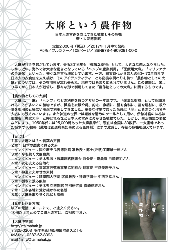 当博物館の書籍「大麻という農作物」につきまして、遅くなりましたがようやく発売の運びとなりました。