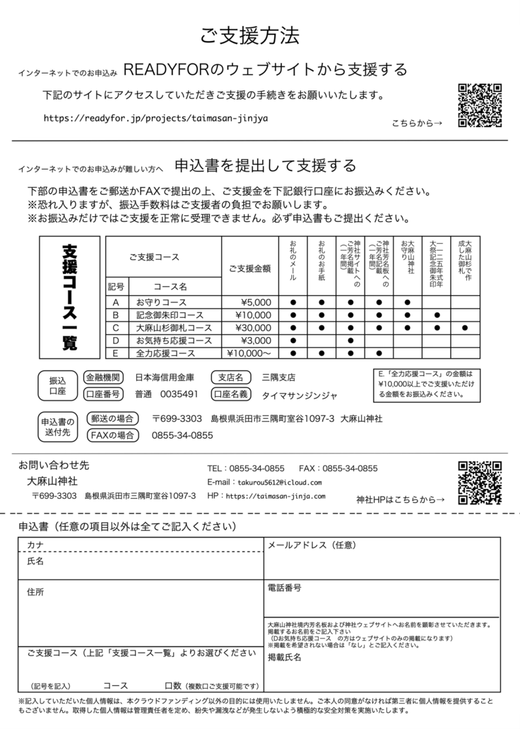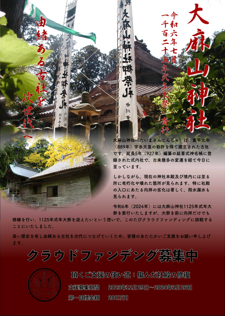 ※ お申込みとご入金が確認でき次第、大麻山神社が代理でクラウドファンディングの手続きをさせていただきます。