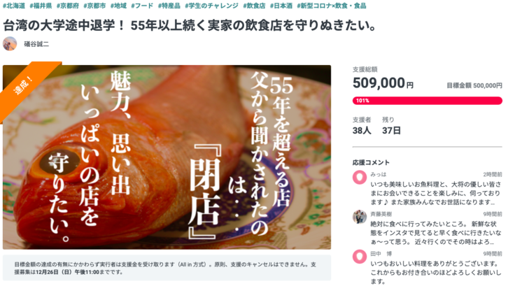 目標金額に達成しましたが、このプロジェクトはまだまだ継続します。なぜならば、本プロジェクトの真髄は金銭的目標ではなく、経営継続だからです。そのために、寄付による一時的な資金調達よりも、この機会を通してより多くのお客様に『還元、新たな発見』を得てもらいたいと考えています。この活動で沢山の方に大将を利用してもらい、大将の魅力を直に感じてもらいたいです。リターン内容によれば、多くのお客様から『損してない?』と言ってもらいます。金銭的に見ると損をしていますが、今後の経営継続のプロセスの一環になれば良いと考えております。大将のスタッフにも、より働きやすい環境を提供し、第一次産業(地方の商店さん)を潤す。そして今まで以上にお客様にも、美味しく、楽しい空間を提供していきたいです。三方よしの考えで今後も経営を継続していきたいです。引き続き応援よろしくお願いします。