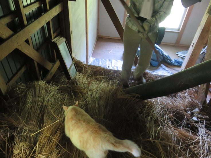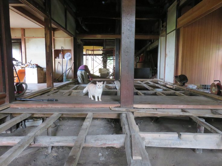 まずは、こつこつ地味に畳剥がし、建具外し作業があります。猫たちにちょろちょろ邪魔・・・癒されながら、作業を進めていきました。