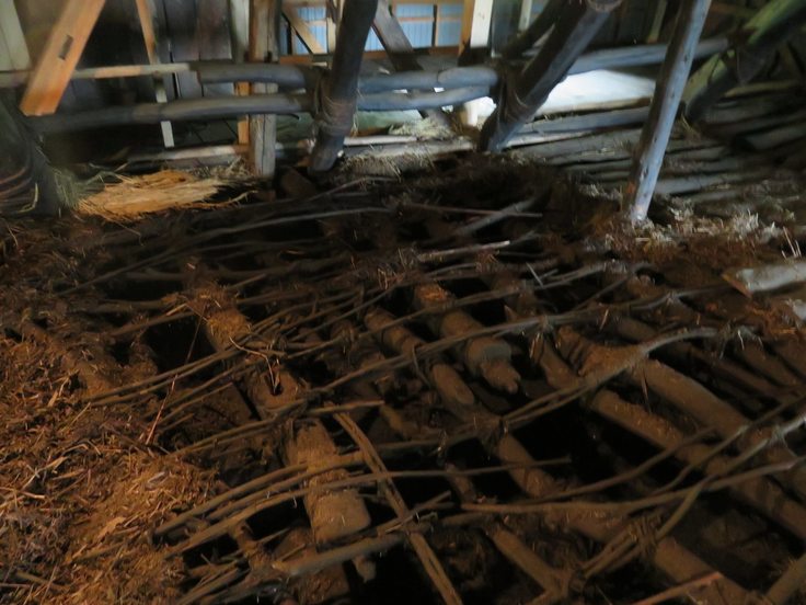 屋根裏部屋で藁を片づけるうちに、床が近くなったぞと思ったら今度は古い煤まみれのムシロが出てきて「藁ゾーン」から「煤ゾーン」へ移行していきました。もちろんすべてにおいて「う〇ちゾーン」でもあります、、、。