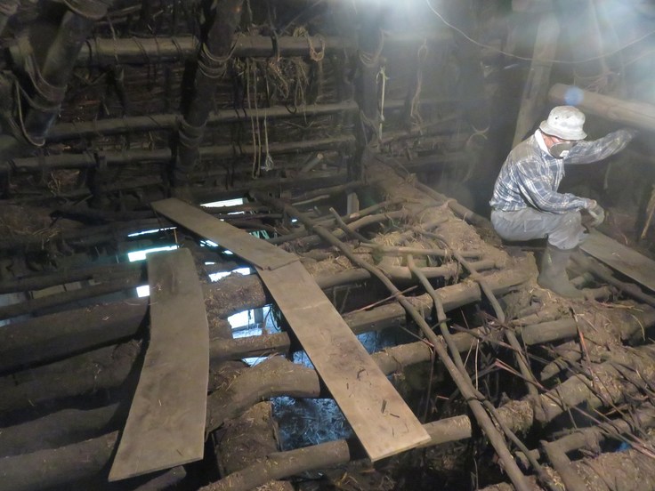 藁を片づけ、ムシロや板など床代わりのものを取り払い、2階から下の土間や居間部分が見えてきました。