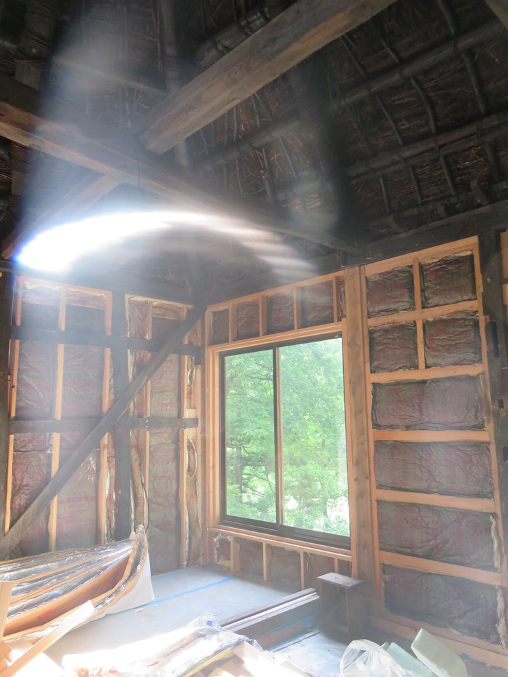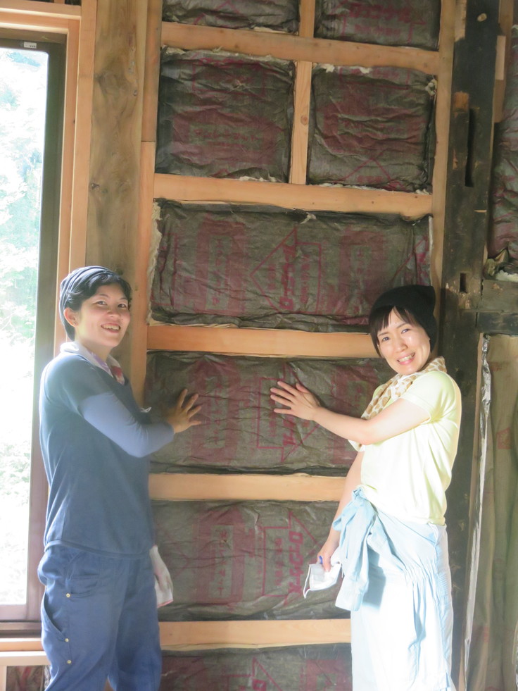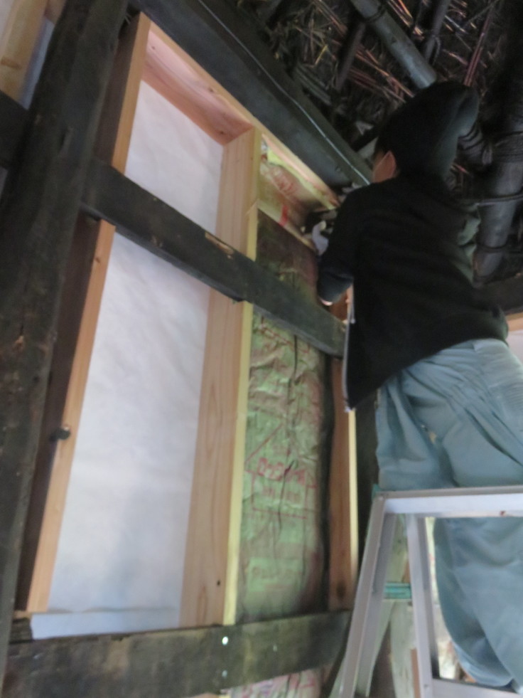 断熱材を入れるといっても、場所により結構ギュウギュウに詰めるとこや、柱や梁や、木枠の隙間を通さなくてはならない場所も多く、しかも断熱材を大きさに合わせて切ったりしながらの作業は、気が付いたらうっすらチクチクしていて(グラスウールの為。後から気が付くという(;^_^A)思った以上に大変な作業でしたが、私よりもがぜん張り切って作業して下さった友人のおかげで、結構な面積を断熱材で覆うことができました。感謝ひたすら感謝です(=^・^=)