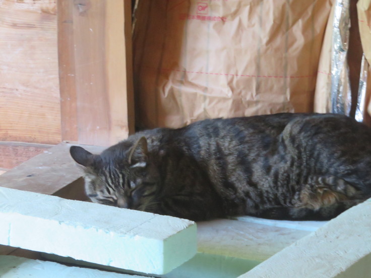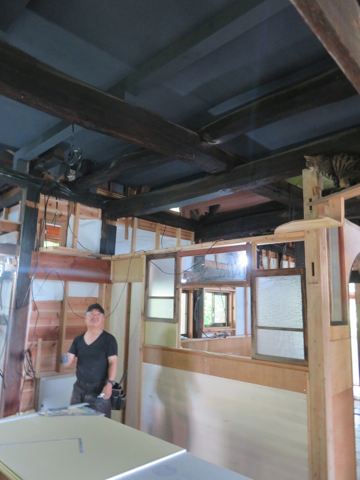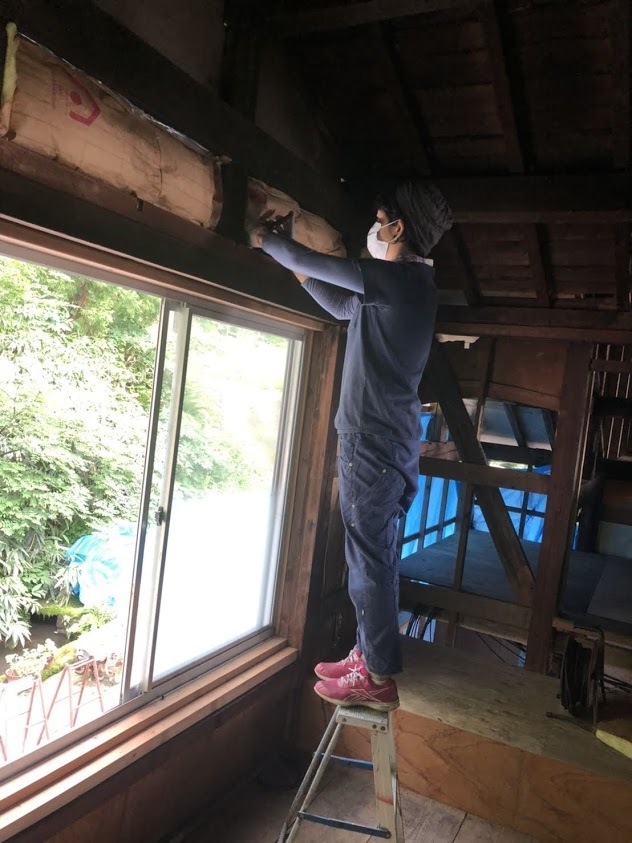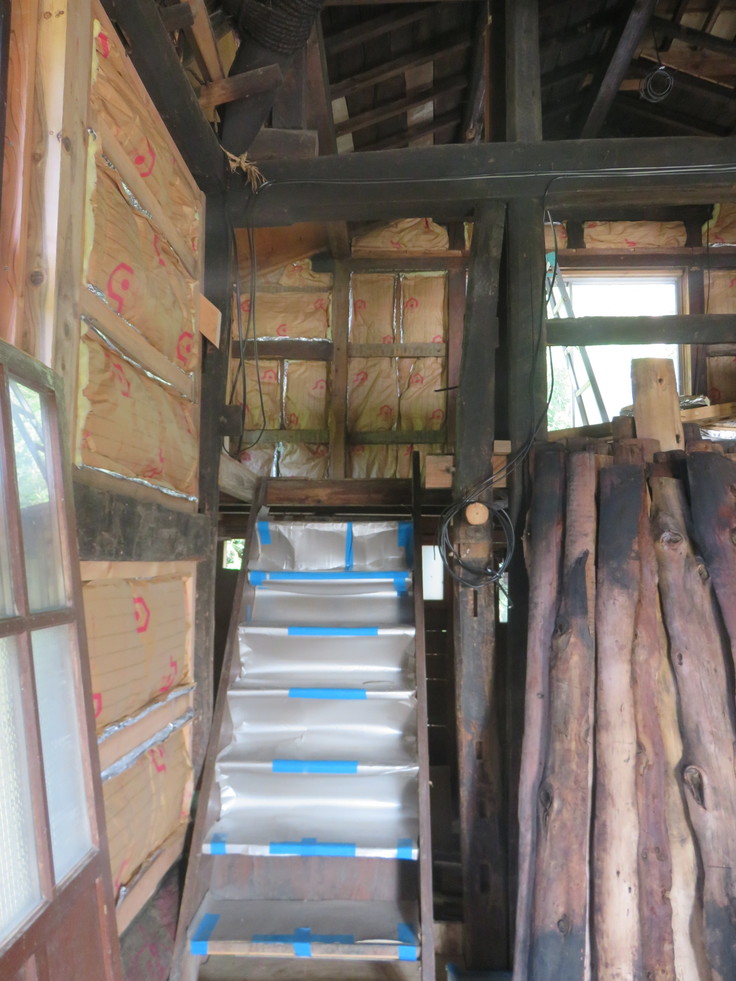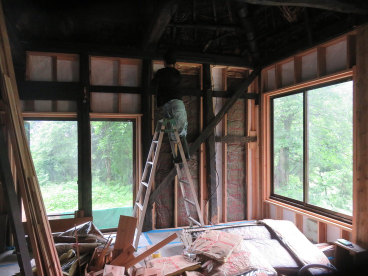 この日は、またご近所の大工さんが朝から助っ人に来てくださいました(もはや主力メンバー?)私たちに断熱材の施工方法をアドバイスしながら、台所の石膏ボード張り等、もろもろしてくださいました。多謝!!!!!!!!!!
