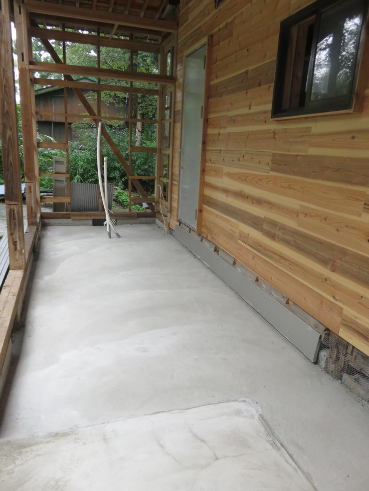 正面の雁木部分をセメント施工しました。ここは元は玄関と押し入れがある広縁?があった場所です。上の屋根裏部屋部分は残し1階の玄関と広縁を減築し外仕様にしました。2つの窓と左の扉は台所部分です。