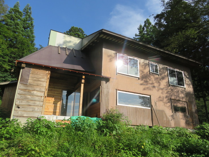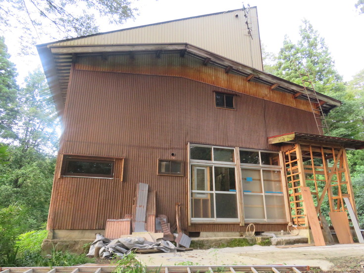 家の裏手部分はここも旧台所を減築しています(左側)。その上の屋根も傾いてボロボロだったので一部減築しましたが、屋根の一部を残したおかげでなんだか素敵なテラスっぽいものが出来そうです。家の中からの景色もよいのですが、ここから見える景色や、外の空気を楽しみながらの休憩もいいものです。