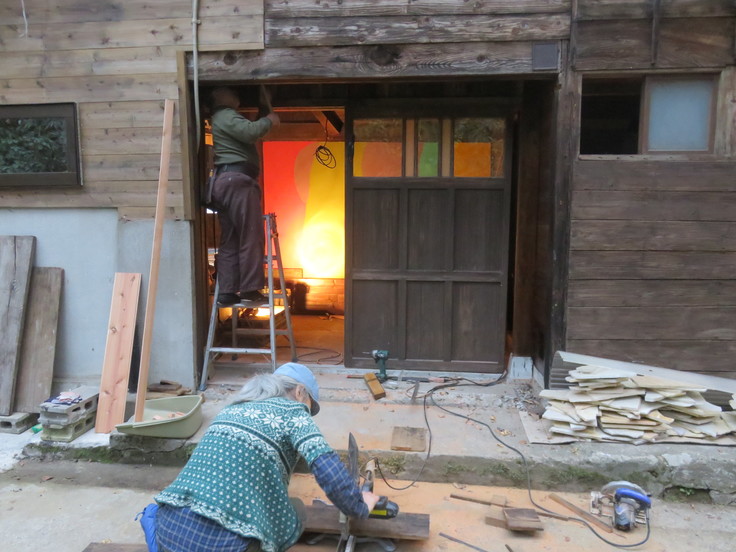 玄関回りです。細かく板を張ったりする作業。入り口の上にも古材を使っています