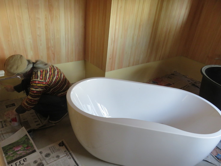 浴室も、壁下部と床のモルタル部分を下地材を2度塗りした後ペイントしました。