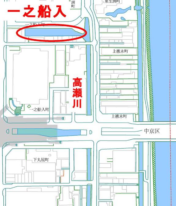 (一之船入は高瀬川の起点にあります。右の川が鴨川)