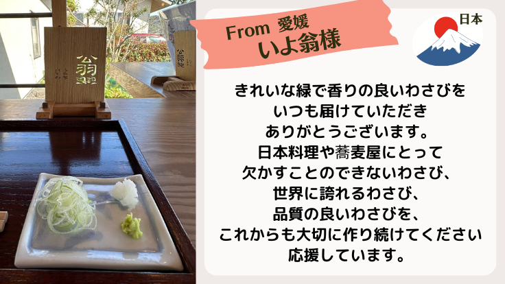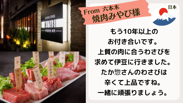 静岡県の美しい山に囲まれた中伊豆で30年以上、見た目だけでなく、辛味、風味、色、甘みにもこだわったわさびづくりをしています。