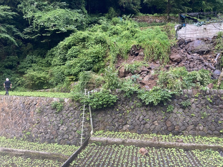 そして昨年、遂に5メートルを超える石垣が崩れてしまいました。周囲に重機が入れるような場所はなく、作業は全て手作業で修復しなければなりません。しかも5メートルという高さも重なり、復旧工事にかかる費用は400万円を超えていました。台風や大雨、地震のような自然災害で被害を受けた時にしか国の災害復旧支援が得られません。そのため、石垣の復旧工事を自費で行わなければなりません。