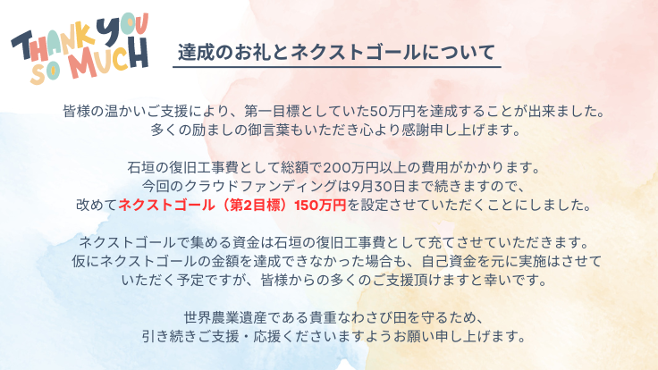 クラウドファンディングでご寄付頂いた支援金は石垣崩落復旧工事費として全額充てさせて頂きます。