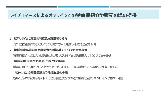 高島市に新設する「Taka.sta(Takashima Internations Station)において、ライブコマースを開催し、海外の拠点とオンラインでつなぎ、地域の酒屋さんなどと共に地域特産品の紹介や販売、また語学学びあいの場などを定期的に行います。京都市において長年実施してきた国際交流活動の人的ネットワークを最大限活用し、開設当初は、11か所の海外拠点と繋いでの運用開始とし、徐々に拡大していく予定です。また、コロナの終息に併せて、リアルに旅行者を高島市に誘導しての運営と併行していきます。
