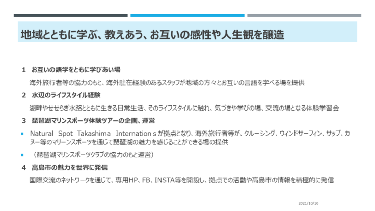 京都を訪れる海外の方々に高島の自然や文化、生活を感じていただき、語学交流会や地域特産品販売等のイベントを通じ、地域の人々との交流の橋渡しをすることで市への来訪者を増やし、高島の魅力が国際的に発信・拡大されるとともに地域の活性化につながることをビジョンとしていきます。また、異なる感性の触れ合いにより、新たな気づきや人生観の変化などが醸成され、双方にとっての益が循環されることを期待し、機会の場を提供していきたいと思います。