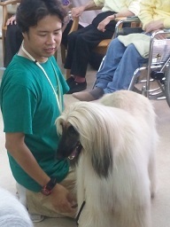 はじめまして。動物介在福祉協会の阿部雅守と申します。店舗で小型犬から大型犬、ドッグショーで活躍している子犬などをどなたでも自由に触る場を提供したことがきっかけで、現在はアニマルセラピー訪問活動に至っています。