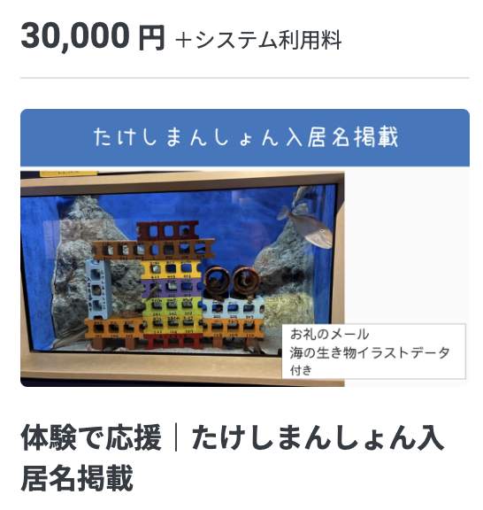 ▶︎体験で応援|たけしまんしょん入居名掲載をご支援されたい方は、下記の画像をクリックすることで、該当のリターンの支援に移動します。