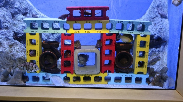 マンションみたいだ…となったので、ブロックに部屋番号をふって、色を塗って、よく来てくださる常連さんの名前を書き始めました。そうしたら常連さんが「あ!私の名前が書いてある!!」とか「私の家に名前が書いてある!」と喜んでくださり、今度は私の名前を書いてよ!と順番待ちになる超人気の水槽になりました。