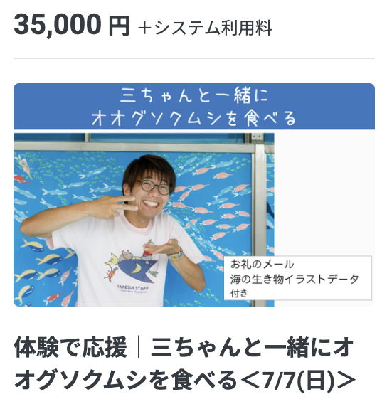 ▶︎体験で応援|三ちゃんと一緒にオオグソクムシを食べる<7/7(日)>をご支援されたい方は、下記の画像をクリックすることで、該当のリターンの支援に移動します。