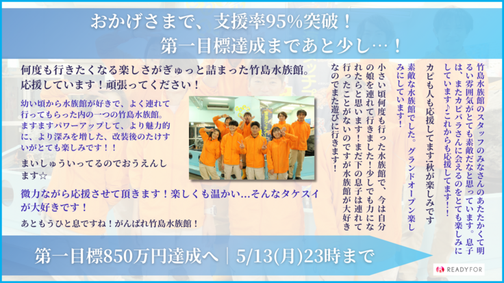 もちろん、まだ第一目標は達成していませんし、その先のより良い展示を目指したセカンドゴールも考えていますので、これからも竹島水族館の活動を見守っていただければと思います。