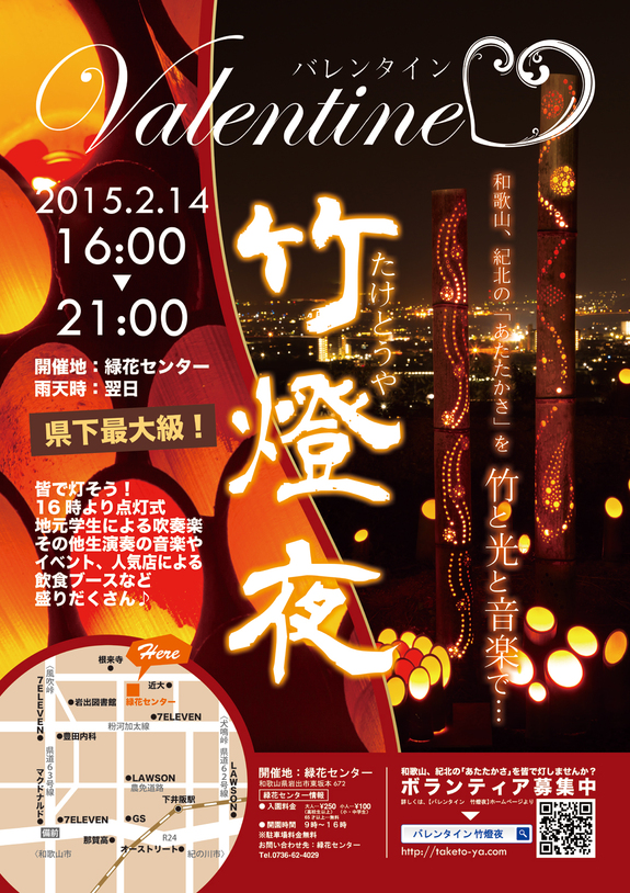 地元の、まちおこし団体さんが、2015年2月14日に緑地後援の緑花センターで、初の夜間営業となる竹とロウソクを使った、キャンドルイルミネーションイベントを行います。
