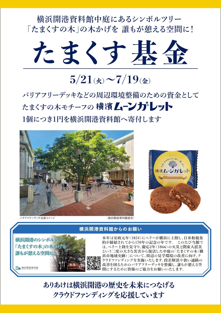 株式会社ありあけからは、「横濱ムーンガレット キャラメルウォールナッツ」と新商品の「開港ハーバー 抹茶黒蜜」のセットをリターン商品として展開していますので、ぜひこの機会に「たまくすの木」や横浜開港の歴史とともに知って頂ければ幸いです。