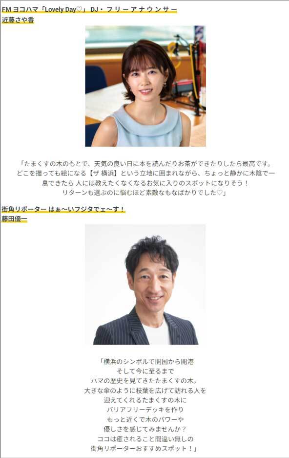 FM ヨコハマ「Lovely Day♡」 DJ・フリーアナウンサーとしてご活躍の近藤さや香さんと、同じくFM ヨコハマ街角リポーター「はぁ~いフジタでェ~す!」でおなじみの藤田優一さんから応援メッセージをいただきました。プロジェクト本文ページに掲載させていただきました。応援ありがとうございます。