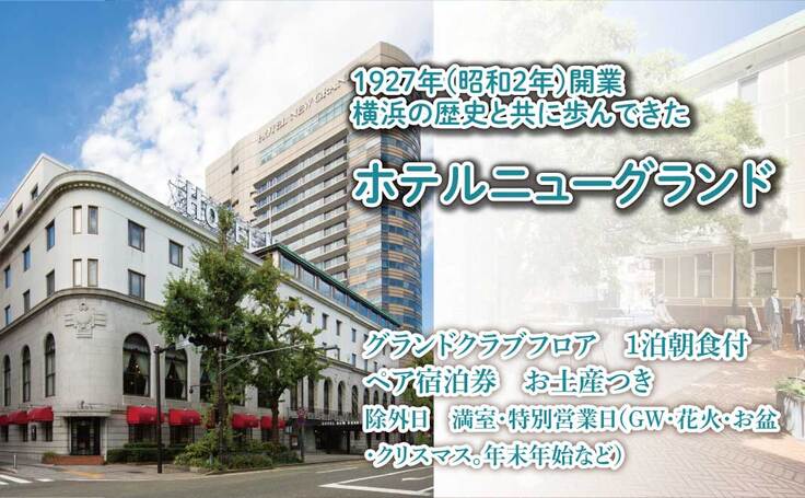 ▼歴史と伝統のホテルに宿泊して応援 ホテルニューグランド グランドクラブフロア 1泊朝食付 ペ ア宿泊券 200,000円