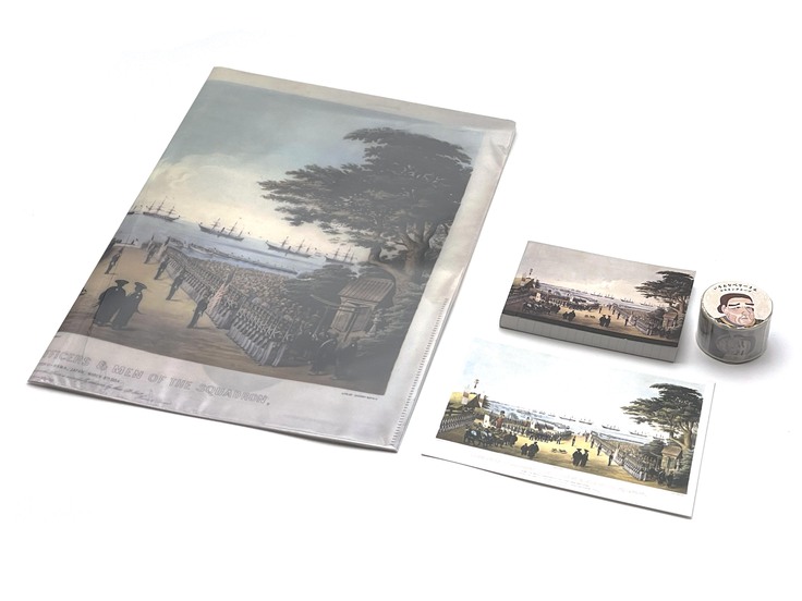 横浜開港資料館のミュージアムショップPORTER’S LODGEで人気のペリー提督やその横浜上陸を描いた「ペリー上陸図」を素材として使用したオリジナルグッズです。 (セット内容:ダブルポケットクリアファイル ・メモ帳 ・マスキングテープ ・ポストカード 各1点)