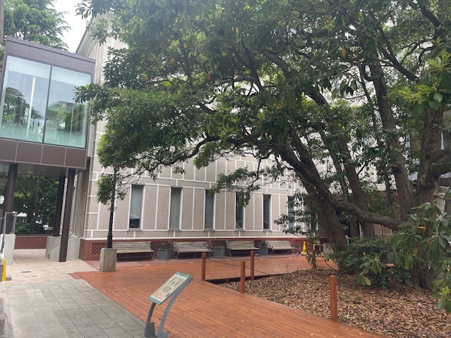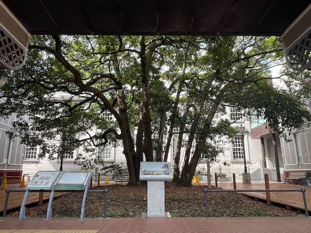 海岸通りの正門側からは土壌部分から「たまくすの木」が生えている様子が見えます。
