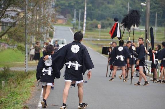 (江戸時代後期から続く氷上町中野に根付く祭り「奴振り」父と子で参加している後ろ姿。男児がなかなか出ない現状、ずっと祭りに出続けている息子をねぎらう父の大きな手。温かく見守り、祭りを力強く残そうする様子。)