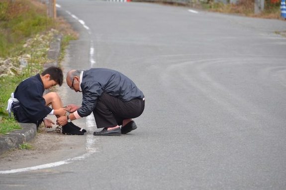 (江戸時代から続く丹波の氷上町中野に根付く祭り。子供が草履がすり切れて歩けなくなったのに気付いた村のおじいちゃん。そっと近づき、草履を編み直し、小学生をいたわる様子。村全体で子供を守り育てる美しい光景。)