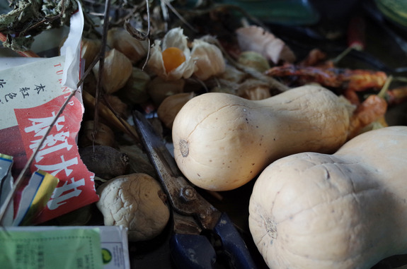 (乱雑に置かれている農家さんの作業台。写真を撮るのをはずかしがる農家さん。しかし、美しい暮らしの中には、乱雑に見える作業台の中に美しさが宿っているとわかる一枚。)