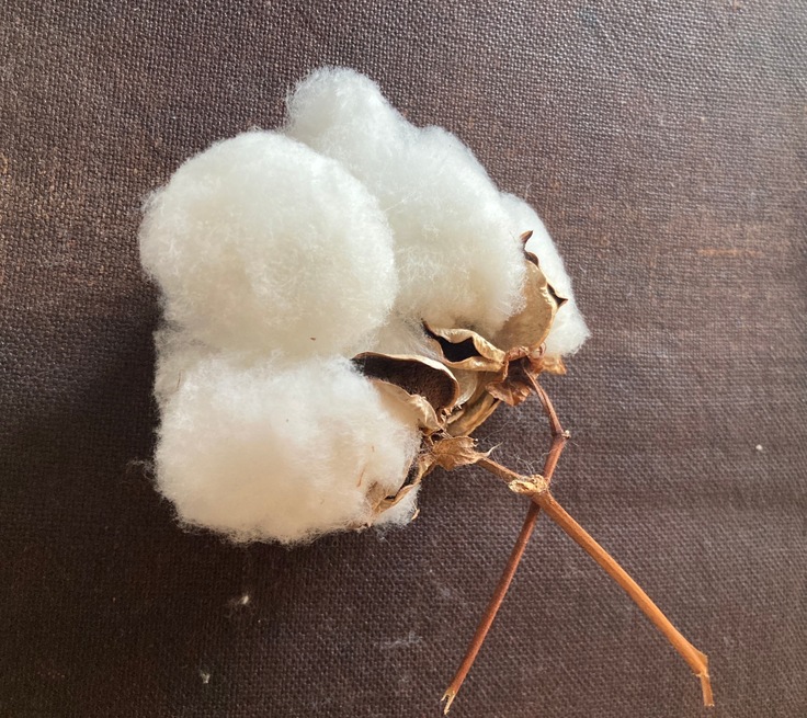 丹波布の原料は、綿です。それを糸車で紡いで糸にし、その糸を草木で染め、布に織り上げていきます。