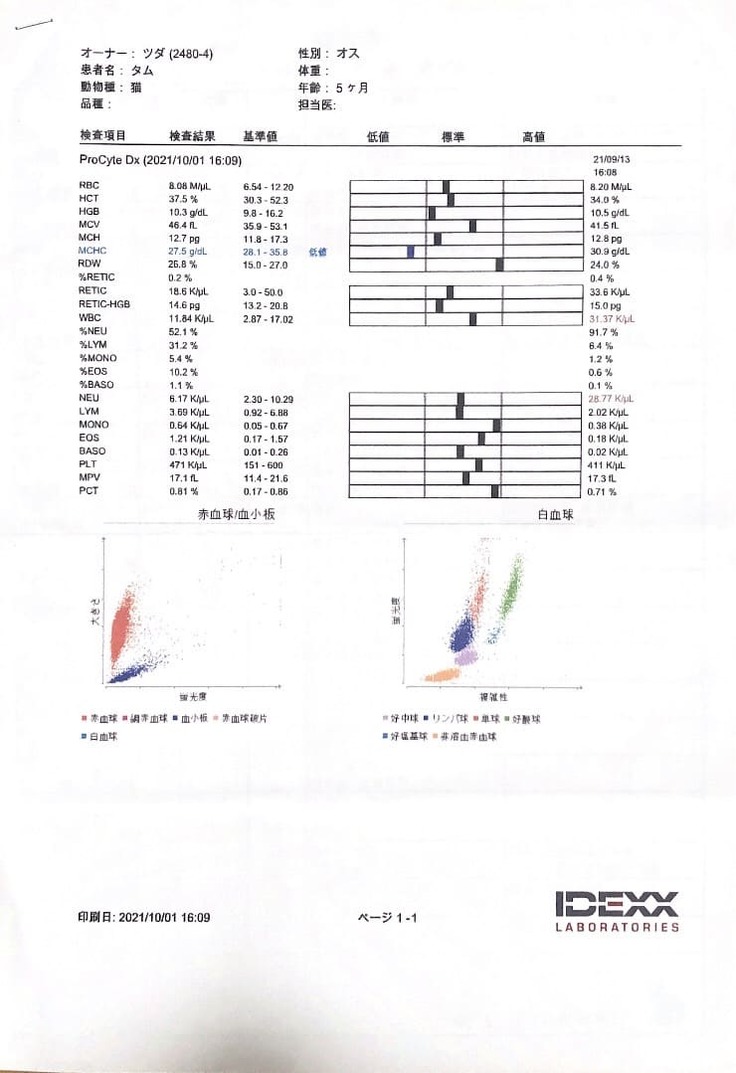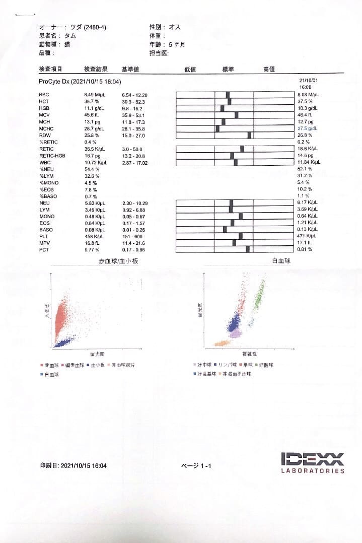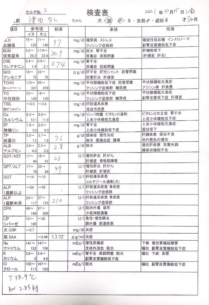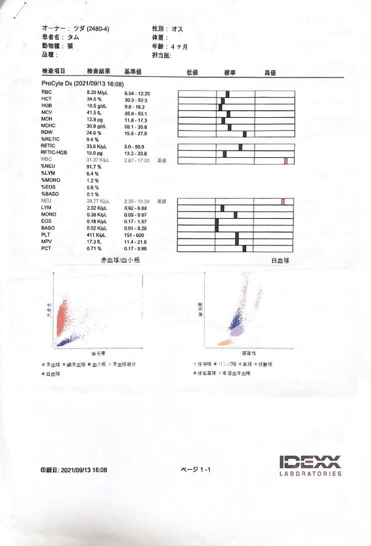 9月13日 朝、タムのお腹がパンパンに膨らんでいることに気づき、すぐ病院に連れて行きました。タムは、食欲があり、元気でした。病院での体重は2.3kg、熱は39.9度でした。