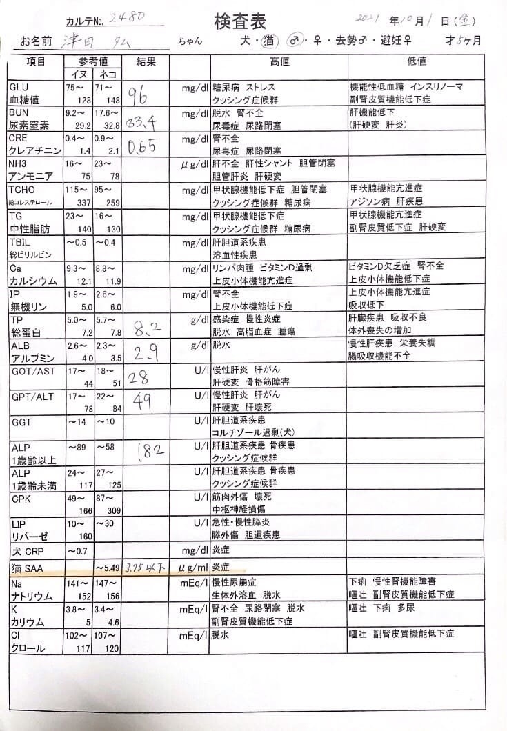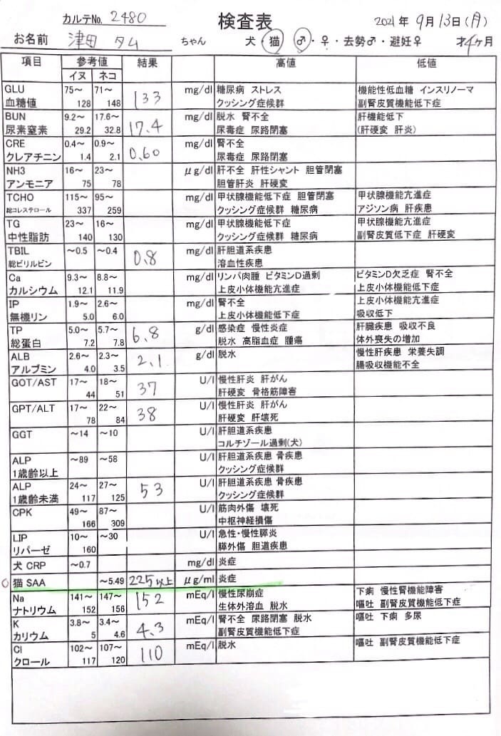 検査の結果、腹膜炎を起こしており、腹水が溜まっているとのことでした。血液検査の結果、SAA(急性総蛋白の血清アミロイドA)が異常に高く炎症を起こしていることがわかりました。また、若年猫・発熱・腹水の3つからFIPの症状の可能性が高いと診断されました。