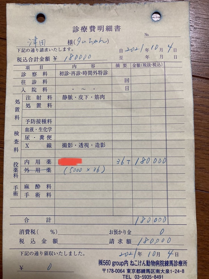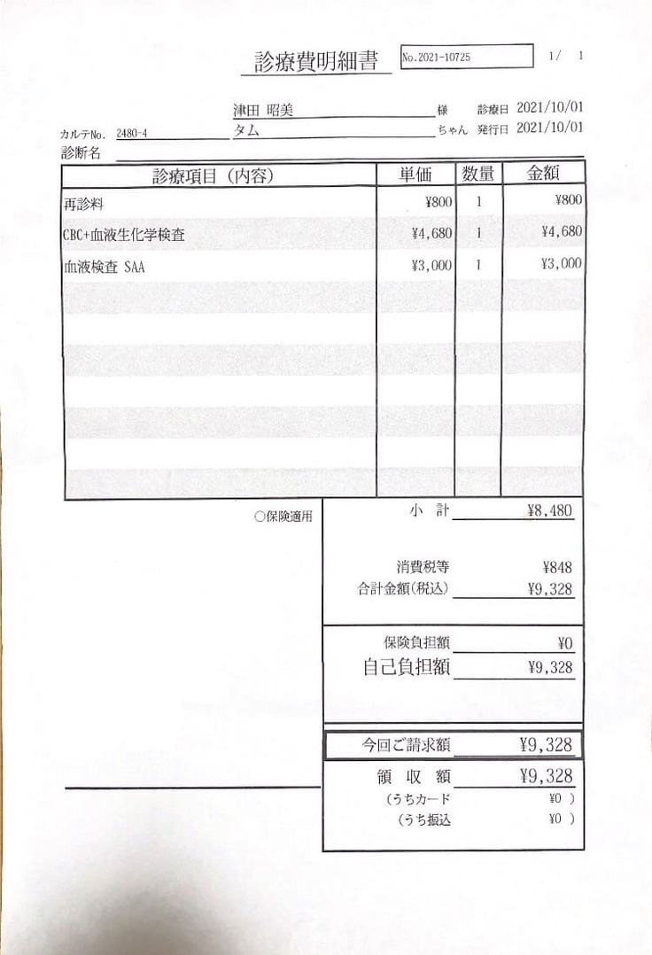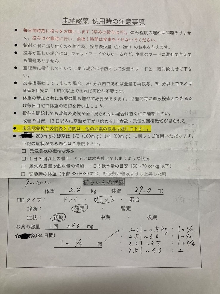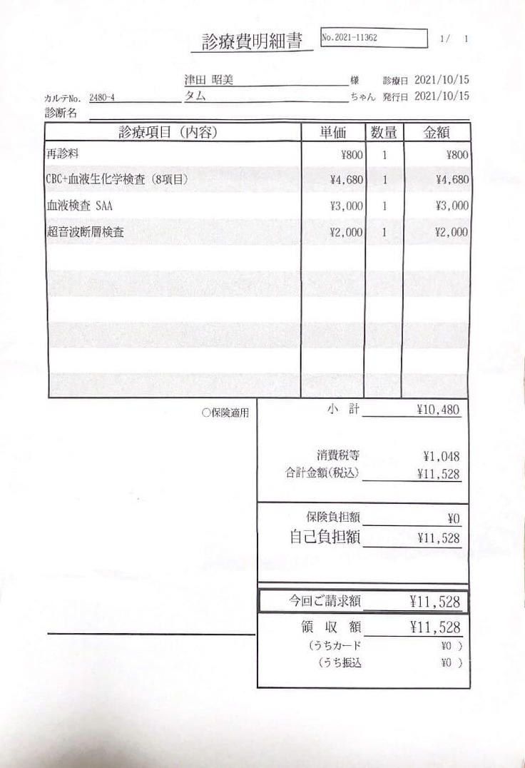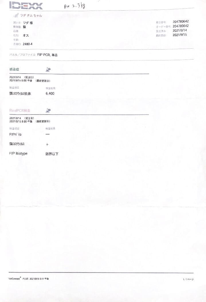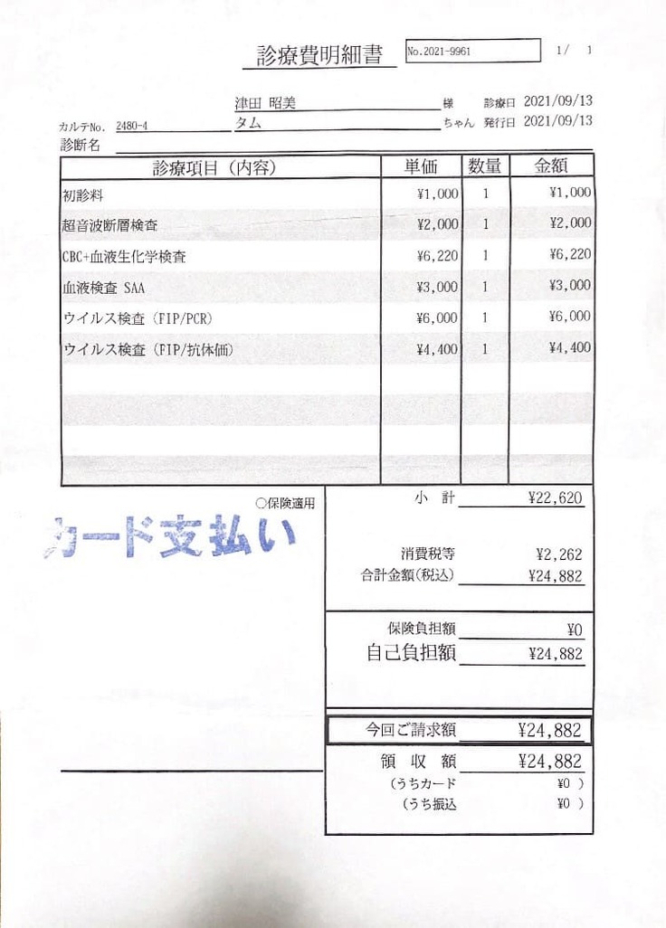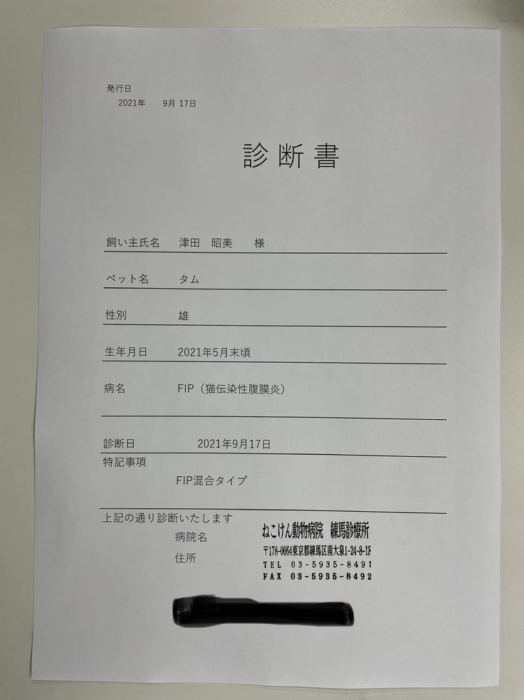 また、FIPの治療は、東京の病院で、エコー検査と血液検査は近くの病院で診てもらっています