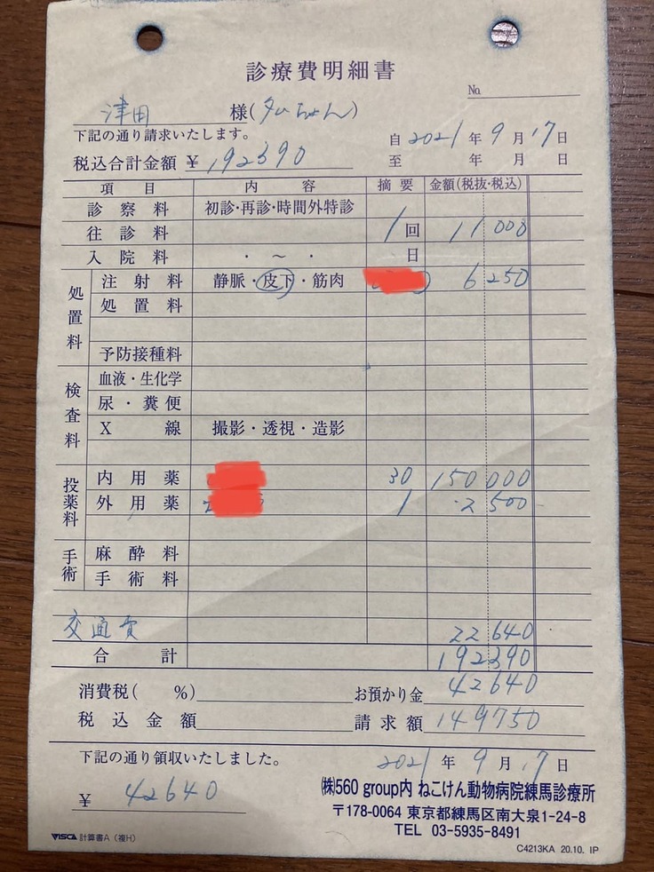 高額だけど治る薬があることが分かりました。近郊にFIPの治療をしてくれる病院はなく、色々と検索し、東京の保護猫団体「ねこけん」に辿り着き、すぐに連絡を取りました。その団体からFIP治療をしている病院を紹介していただき、治療がスタートしました。