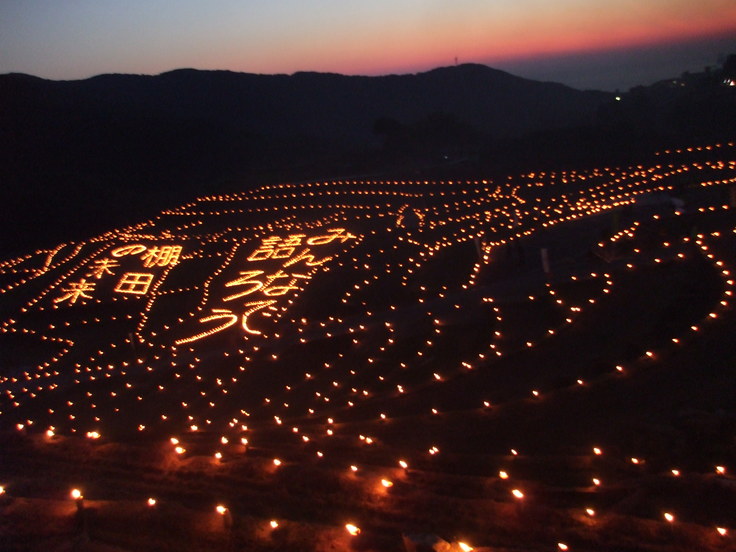 この景色を見たとき、都市と農村の方々が一体となって、美しい棚田を未来につなぐ想いに感動し、涙がとめどなくあふれ出て、棚田を未来につなぐ想いを再確認しました。その後活動のきっかけの香美町の棚田でも仲間と一緒にキャンドルを棚田に並べ、下記の写真の取り組みを行いました。
