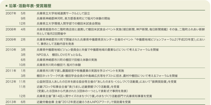 プロフィール(永菅裕一・NPO法人 棚田LOVER’s 理事長、古民家しろめて代表) 高校時代、環境問題に関心を持ち、姫路工業大学環境人間学部、 兵庫県立大学大学院環境人間学研究科卒業。 環境と人間に関して分野の枠を越えて、総合的に学び、 そして、環境教育が環境問題に重要な役割を果たすと気付き、研究を行う その中で棚田と出会い、環境教育と棚田のつながりを強く感じる。 そして、地域の方々から、棚田が失われていることを伺い、 2007年5月に棚田LOVER'sを仲間と結成。 生物・食・農の大切さを伝え、棚田を未来の子どもたちにつないでいくために、 そして、大学や商店街での棚田PR活動、米や自然体験系の企画を年60回程度行い、 140団体と連携し、メディアにも165回以上掲載される。 人と人やニーズとニーズ、違う分野と分野をつなぐことに喜びを感じ、 人の想いやニーズをつなげている。