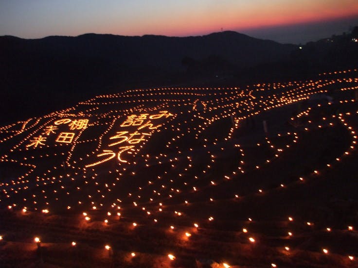 夜になり、棚田がたくさんのたいまつでとても美しいに・・・!!