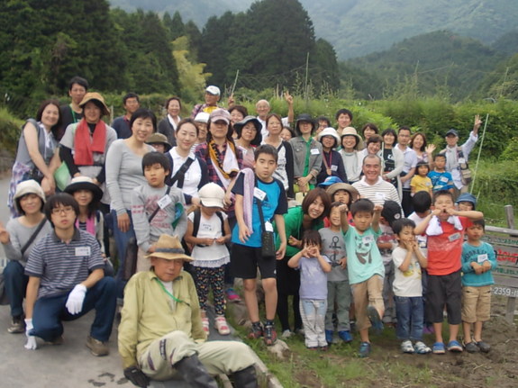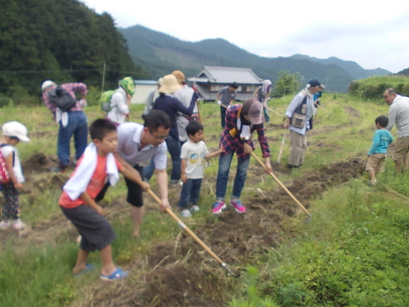 都市(尼崎など)から来てくださった親子の子どもたち約40人と棚田で大豆のたねをまきました。
