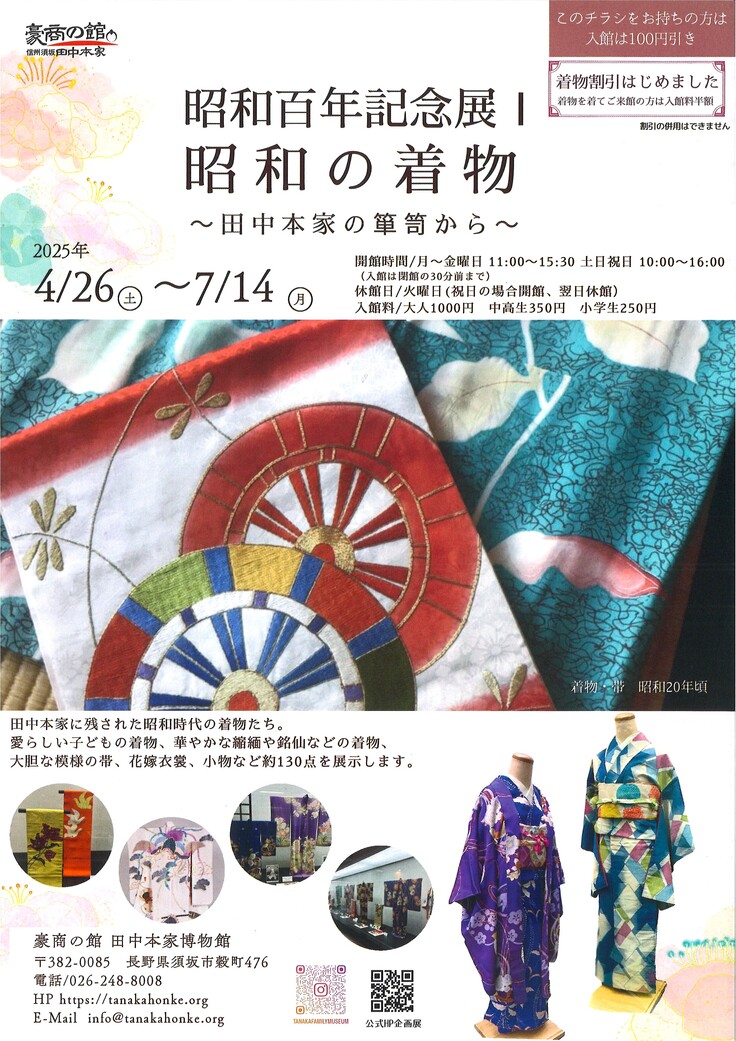 昭和100年記念「昭和の着物 田中本家の箪笥から」を開催しています。