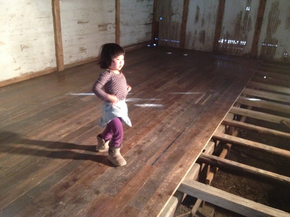 舞台、ボロボロに穴の空いていた床を外し、大引、根太をやり直し、いよいよ色川小学校からもらってきた床材を貼っていきます。1日三分の1ペース。足元が決まってくると何か頼もしくなる!