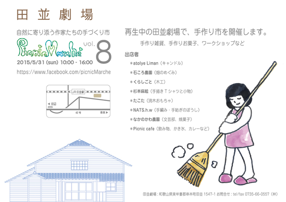 コツコツと再生を続けている田並劇場ですが、今月末(5月31日)に途中経過見学を兼ね、手作り市を開催します。自然に寄り添う作家たちの手作り市「Picnic Marche」は、主に紀南地方で暮らしの中でコツコツと作品を作り続けている作家さんたちが出店するマルシェ(市)で、今までに田辺や串本などで開催され、今回で8回目となります。再生中の田並劇場でということで、今回は小規模ではありますが、田並劇場初イベントです! 興味がある方は是非、足をお運びください!